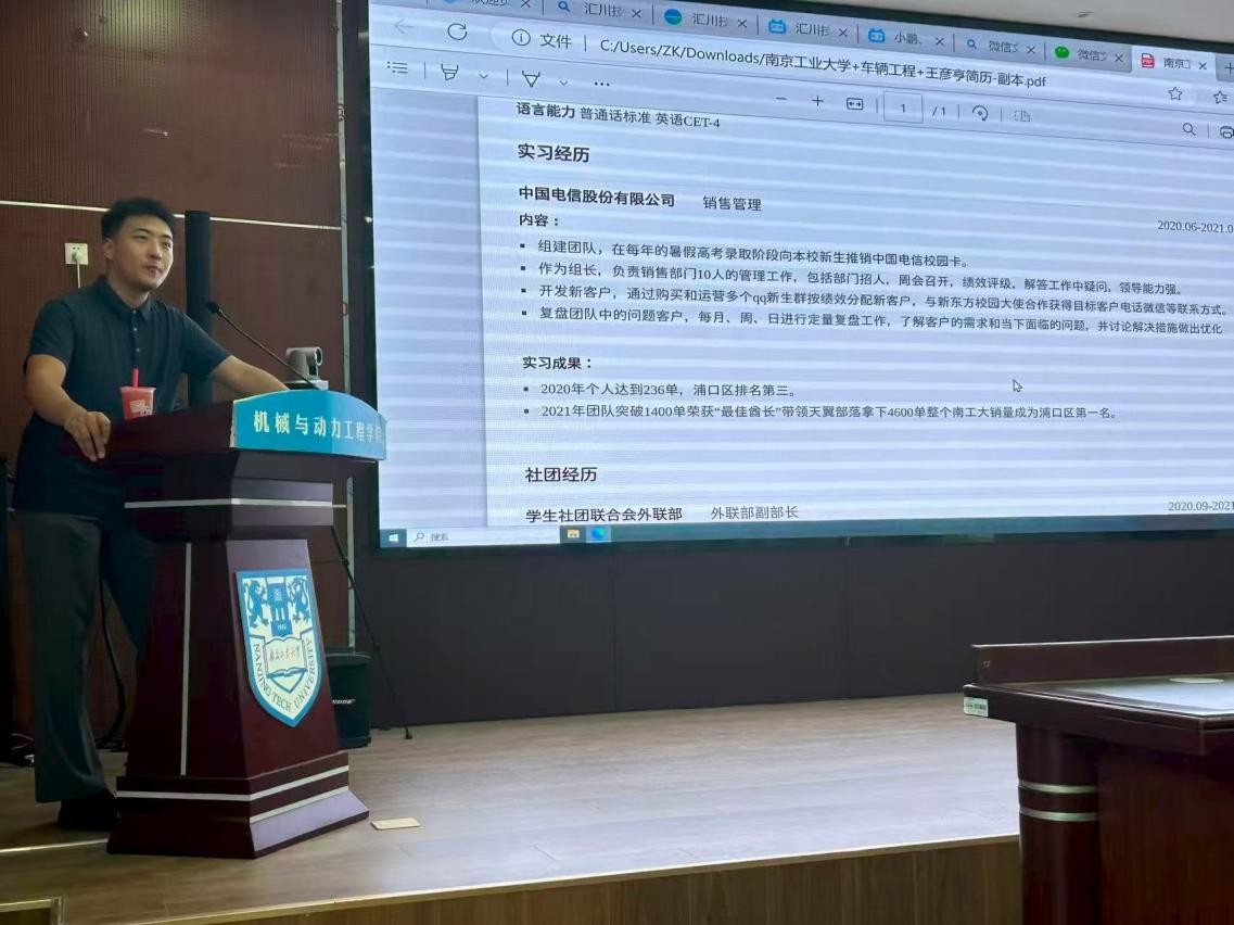 校友王彦亨结合自身在苏州汇川技术有限公司的工作经历,从行业发展趋势、企业人才需求两方面展开分享。他以汇川技术在工业自动化领域的技术突破为例,详细解读了机械专业在智能制造、新能源装备等方向的就业机遇。随后,他结合自身求职经历,围绕“简历优化”、“面试技巧”、“职场适应”三大核心话题展开分享,强调简历需突出项目成果,用数据体现能力,建议提前积累实习经验,明确职业匹配度。