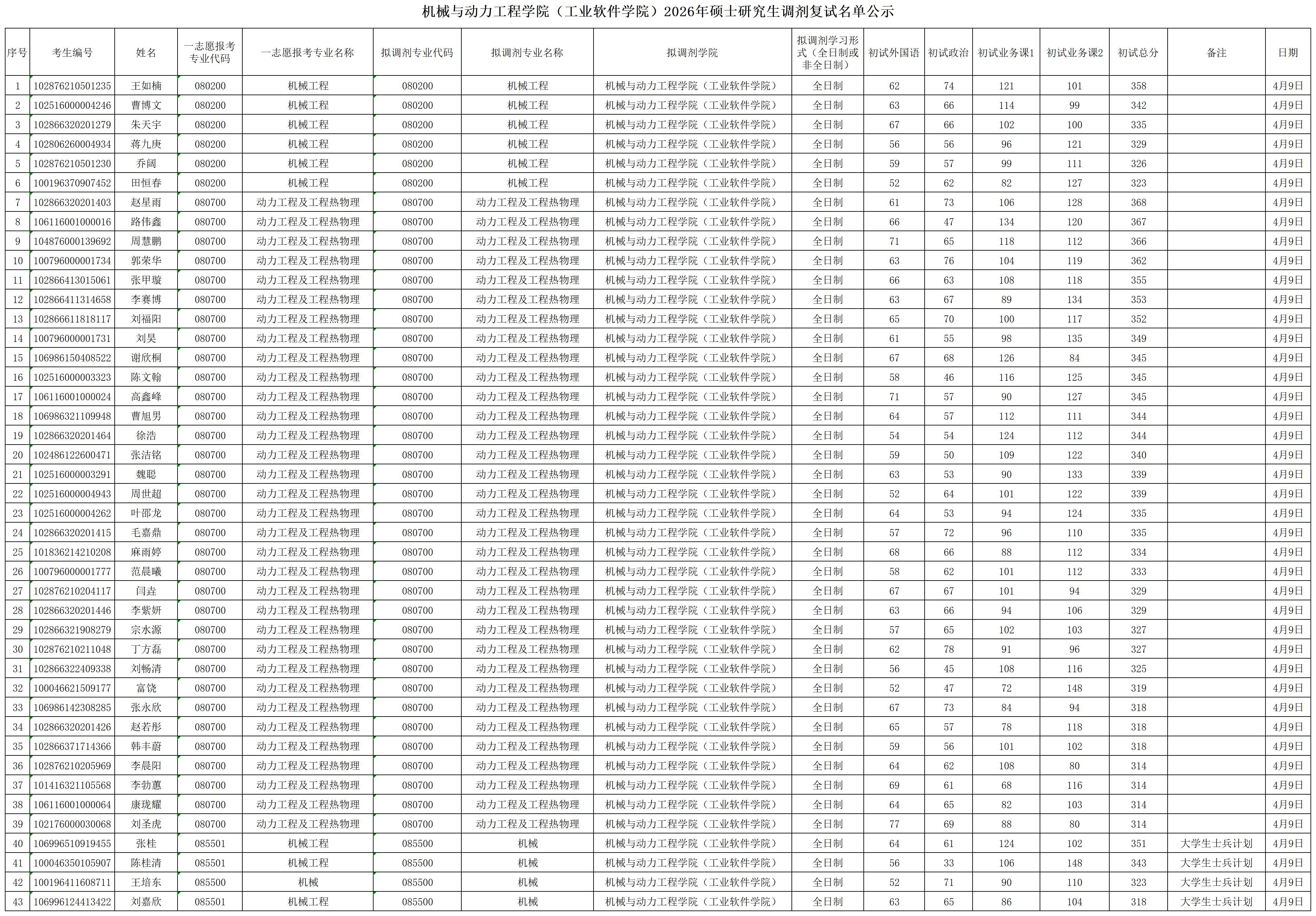 机械与动力工程学院(工业软件学院)2026年硕士研究生调剂复试名单公示
